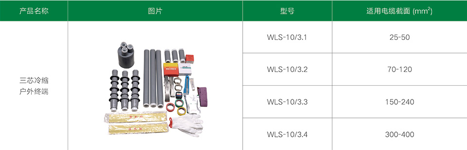 10KV三芯冷縮電纜附件系列產(chǎn)品,適用于3.6/6、6/10、8.7/10、8.7/15kV三芯聚乙烯和交聯(lián)聚乙烯電力電纜。采用液態(tài)硅橡膠制造,集防水、應(yīng)力控制、屏蔽、絕緣于一體。具有良好的電氣性能和機(jī)械性能,能在各種惡劣的環(huán)境條件下長(zhǎng)期使用。具有重量輕、安裝方便等優(yōu)點(diǎn)。廣泛地應(yīng)用于電力、石油、化工、冶金、鐵路、港口和建筑等各個(gè)領(lǐng)域。