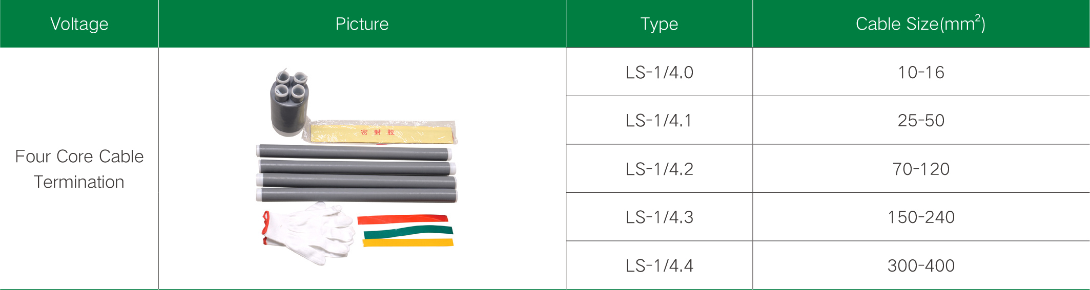1kV cold shrinkable terminal series products, suitable for 0.6/1kV single-core, two-core, three-core, four-core, five-core polyvinyl chloride, cross-linked polyethylene, rubber and plastic power cables, with good electrical and mechanical properties, can be used for a long time under various harsh environmental conditions. It has the advantages of light weight and easy installation. It is widely used in electric power, petroleum, chemical industry, metallurgy, railway port and construction and other fields.