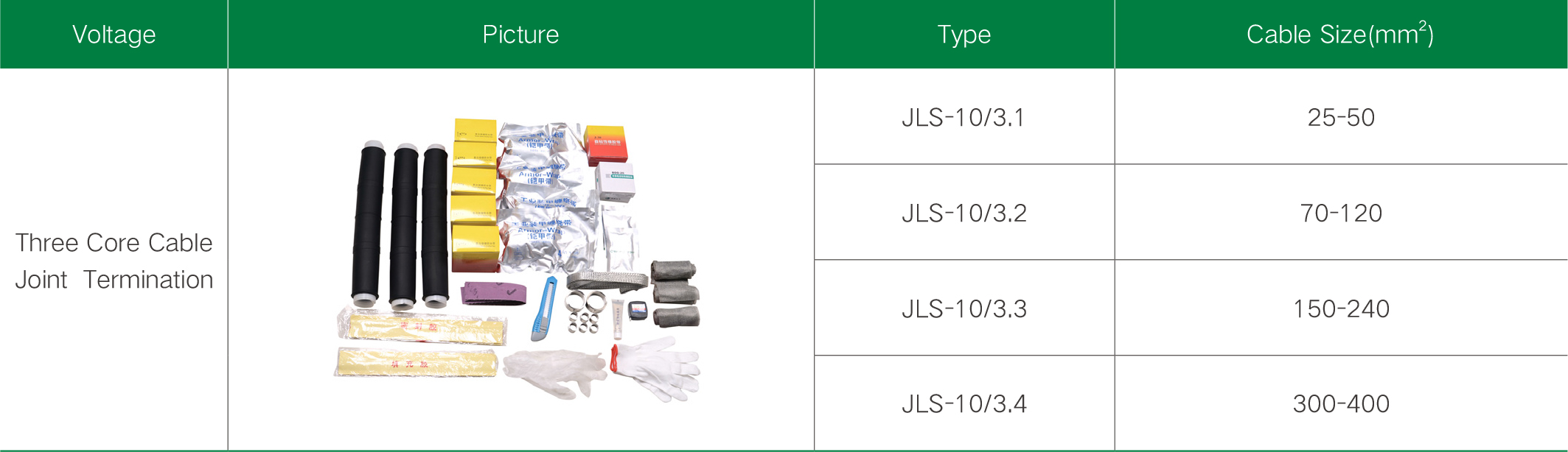 10KV three-core cold shrinkable intermediate joint is suitable for 3.6/6, 6/10, 8.7/10, 8.7/15kVThree-core polyethylene and cross-linked polyethylene power cables. Made of liquid silicone rubber, it integrates waterproofing, stress control, shielding and insulation. It has good electrical and mechanical properties and can be used for a long time under various harsh environmental conditions. It has the advantages of light weight and easy installation. It is widely used in electric power, petroleum, chemical industry, metallurgy, railway, port and construction and other fields.