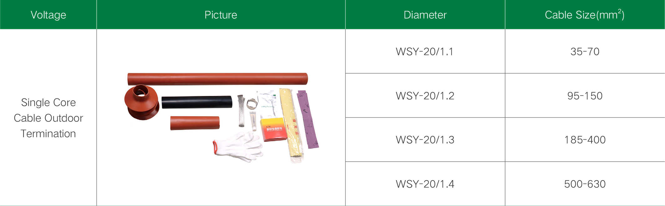 20KV single-core heat shrinkable cable termination accessory is a terminal connection and insulation protection equipment for high-voltage (20kV) single-core power cables. It is suitable for the terminal part of single-core power cables, is used to connect cables with equipment or power distribution systems, and provides reliable cable insulation and connection performance. 20KV single-core heat shrinkable cable terminal accessories are widely used in high-voltage (20kV) power distribution systems for connecting and insulating the terminal part of single-core power cables.