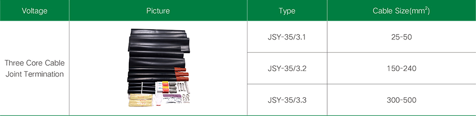 35KV three-core heat shrinkable cable intermediate joint is a kind of connection and insulation protection equipment for high voltage (35kV) three-core power cable. It is commonly used to connect two segments of three-core cable and provides reliable cable connection and insulation performance.